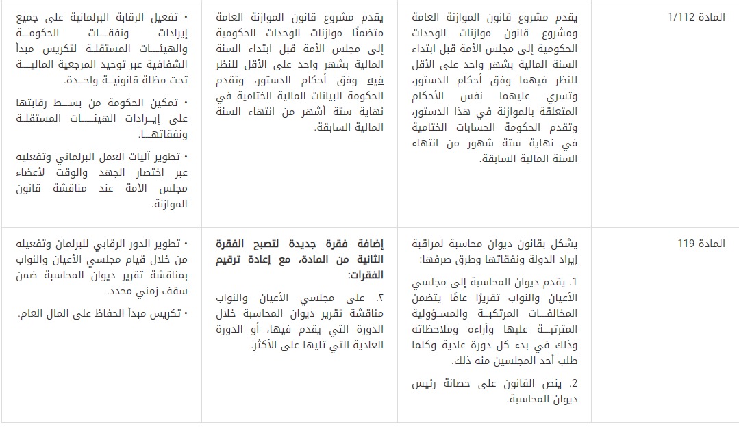 16- قُدمت توصية بتعديل المادة (1/112) من الدستور لصالح دمج قانوني الموازنة العامة وموازنات الوحدات الحكومية في قانون واحد، وذلك من أجل تفعيل الرقابة البرلمانية على جميع إيرادات ونفقات الحكومة والهيئات المستقلة، لتكريس مبدأ الشفافية عبر توحيد المرجعية المالية تحت مظلة قانونية واحدة، وتمكين الحكومة من بسط رقابتها على إيرادات الهيئات المستقلة ونفقاتها، بالإضافة إلى تطوير آليات العمل البرلماني وتفعليه عبر اختصار الجهد والوقت لأعضاء مجلس الأمة عند مناقشة قانون الموازنة.