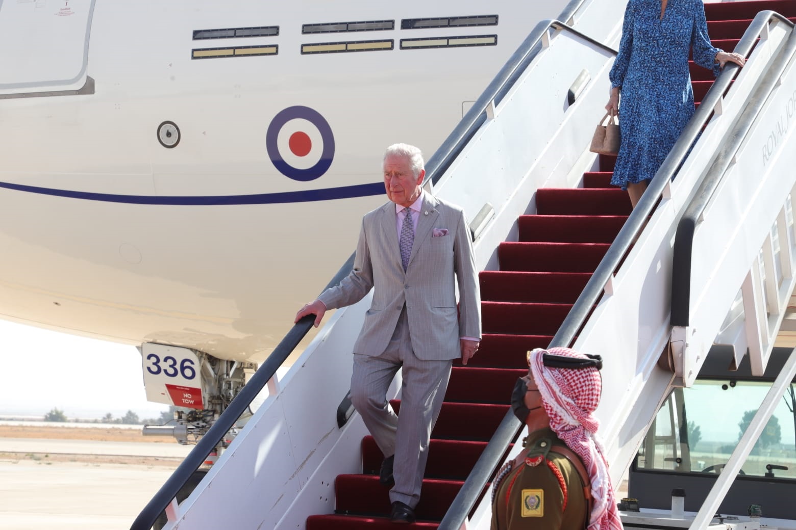 وكان في استقبال أمير ويلز ودوقة كورنوال، سمو الأمير غازي بن محمد، كبير مستشاري جلالة الملك للشؤون الدينية والثقافية والمبعوث الشخصي لجلالته، رئيس بعثة الشرف المرافقة للضيف، وأمين عمان ومحافظ العاصمة وسفير الأردن في المملكة المتحدة وسفيرة المملكة المتحدة في الأردن وأركان السفارة، وعدد من المسؤولين المدنيين والعسكريين.