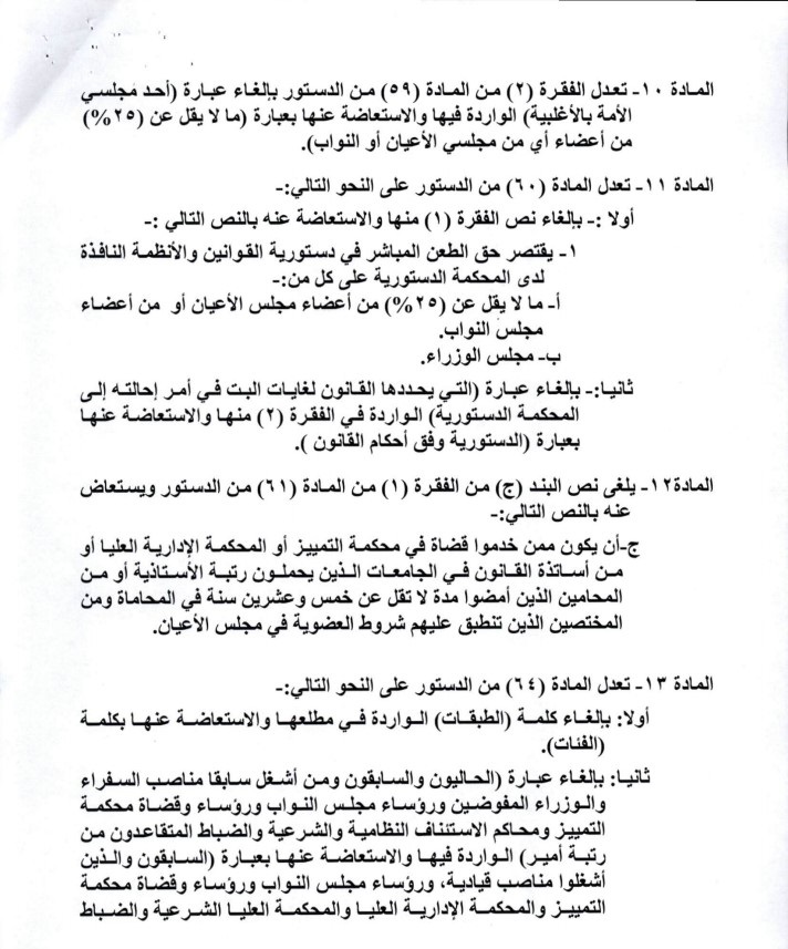 وألغى مشروع التعديل نص المادة (51) من الدستور الذي ينص على “رئيس الوزراء والوزراء مسؤولون امام مجلس النواب مسؤولية مشتركة عن السياسة العامة للدولة كما أن كل وزير مسؤول أمام مجلس النواب عن أعمال وزارته“.