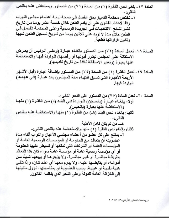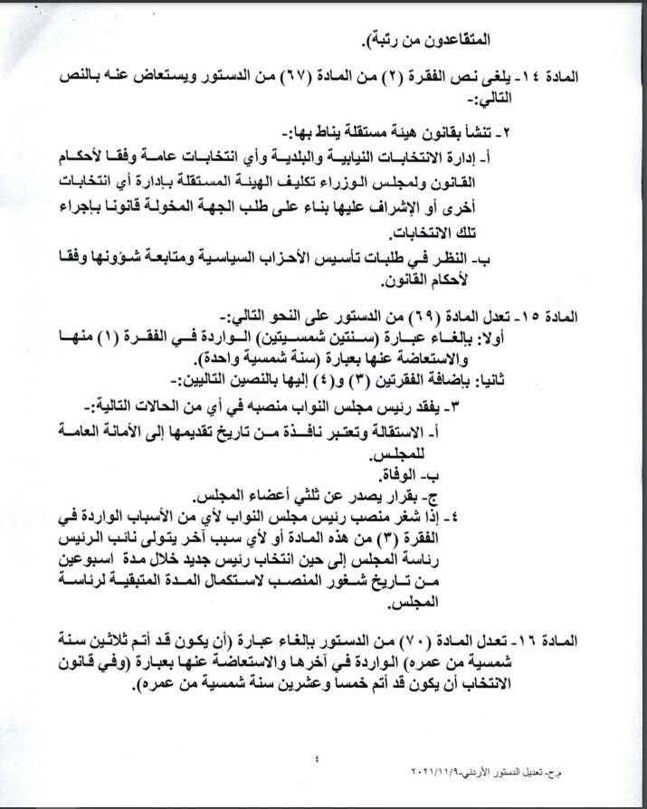 مواد مشروع تعديل الدستور الأردني لسنة 2021