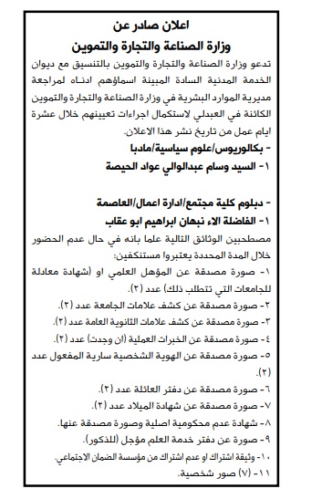 مدعوون لاستكمال إجراءات التعيين في “الصناعة والتجارة” Last updated نوفمبر 24, 2021 Share وكالة الناس ــ دعت وزارة الصناعة والتجارة والتموين بالتنسيق مع ديوان الخدمة المدنية، مرشحين لاستكمال إجراءات التعيين. ودعت الوزارة المرشحين إلى مراجعة مبنى الوزارة، وذلك خلال 10 أيام عمل من تاريخه. وتاليا الأسماء والتفاصيل:
