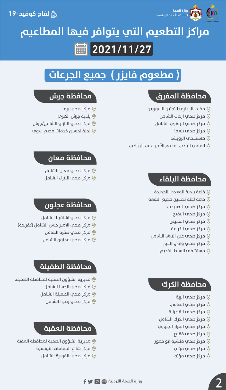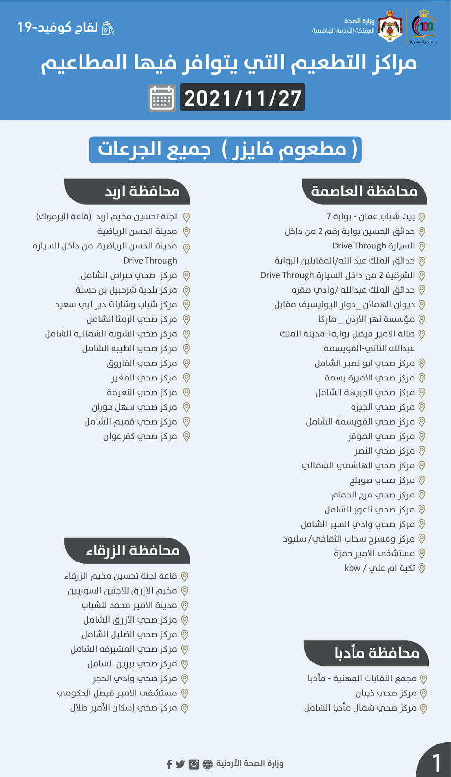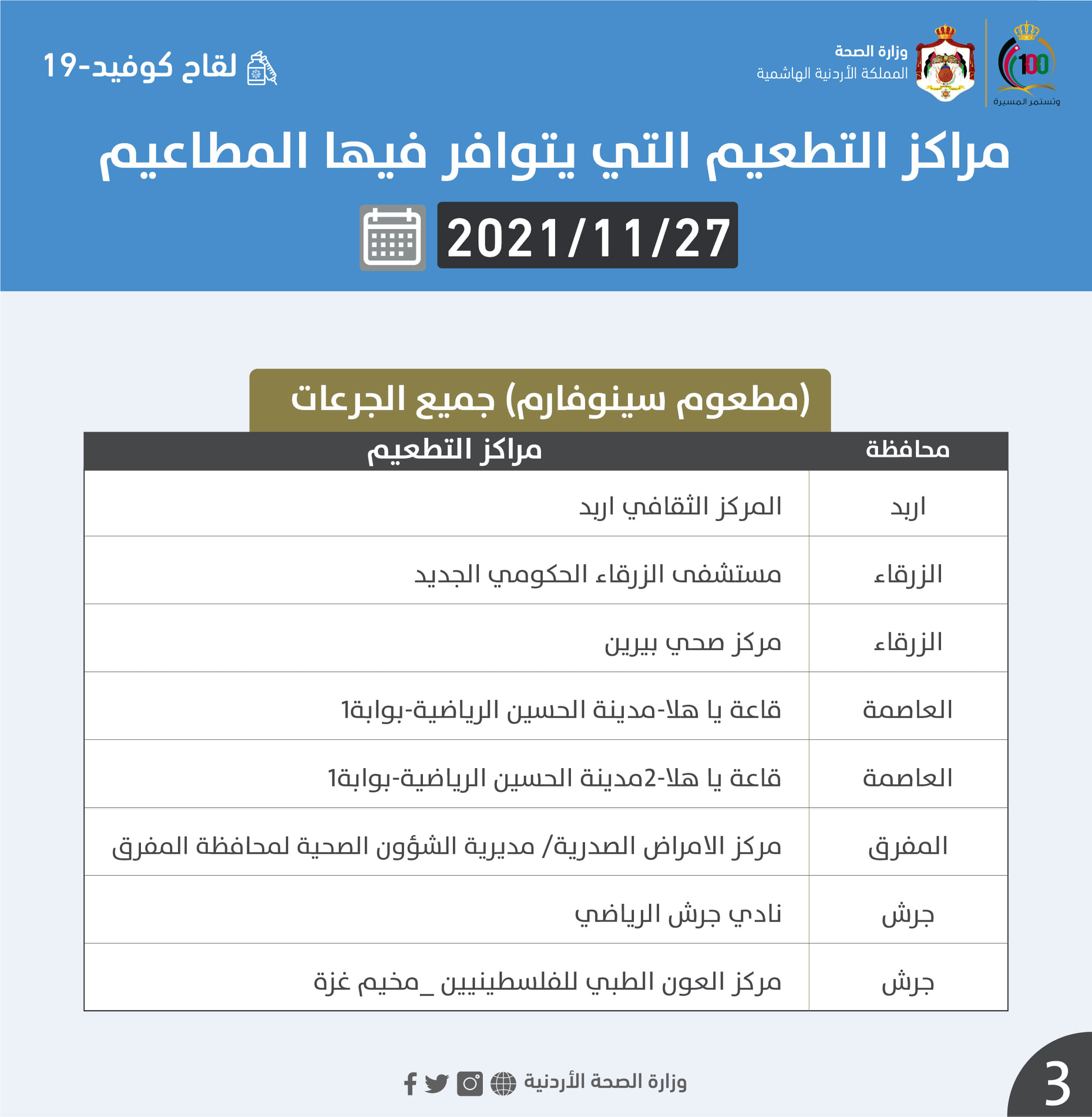 مراكز التطعيم ليوم السبت 2021/11/27 التي يتوافر فيها المطاعيم #جميع_الجرعات :