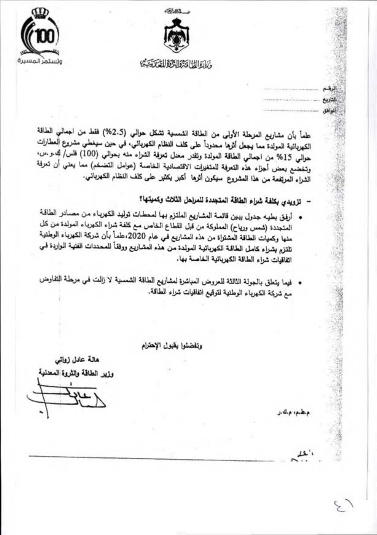 وكالة الناس ــ كشفت وزيرة الطاقة والثروة المعدنية السابقة هالة زواتي، أن معدل تعرفة الشراء من مشروع العطارات تقدر بحوالي 100 فلس/كيلوواط/ الساعة.