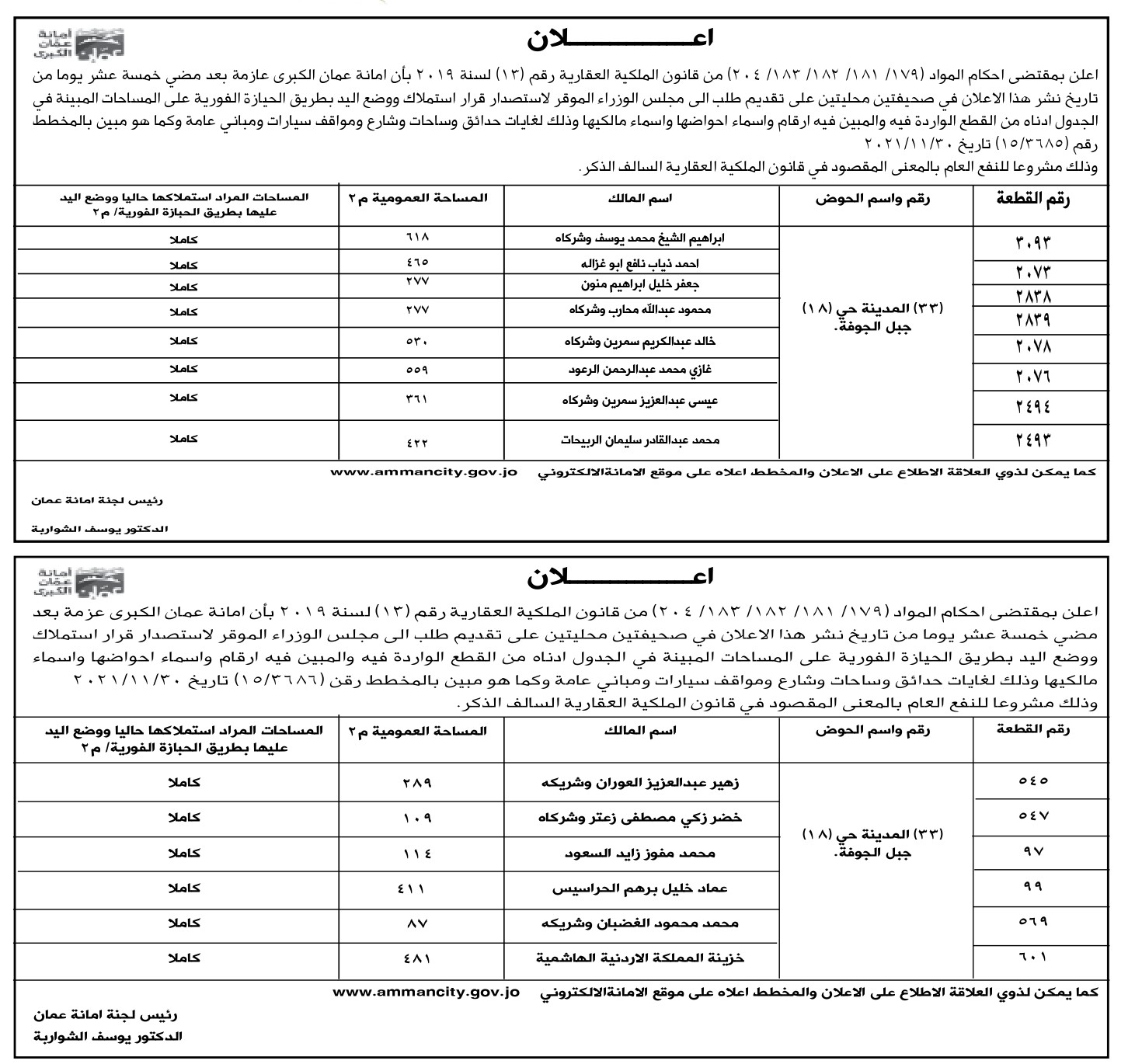 ويأتي ذلك عملا بأحكام المواد (179/ 181/ 182/ 183/ 204) من قانون الملكية العقارية رقم (13) لسنة 2019، لغايات حدائق وساحات وشارع ومواقف سيارات ومبان عامة.