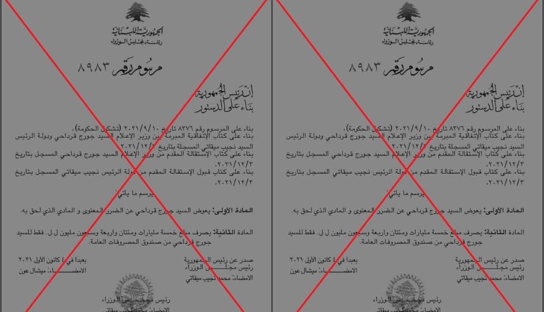وأكد المصدر أن من المرسوم المتداول على أنه موقع من رئيسي الجمهورية والحكومة بشأن التعويضات المزعومة للوزير المستقيل جورج قرداحي مزور وهدفه اثارة البلبلة.