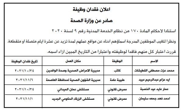 فاقدون لوظائفهم في وزارة الصحة (أسماء) On ديسمبر 12, 2021 Share أعلنت وزارة الصحة، اليوم الأحد، عن فقدان 4 موظفين لوظائفهم، نظرا لتغيبهم عن مواقع عملهم لمدة تزيد عن 10 أيام متصلة أو متقطعة. ويأتي ذلك، استنادا لأحكام المادة 170 من نظام الخدمة المدنية رقم (9) لسنة 2020. وتالياً الأسماء والتفاصيل: