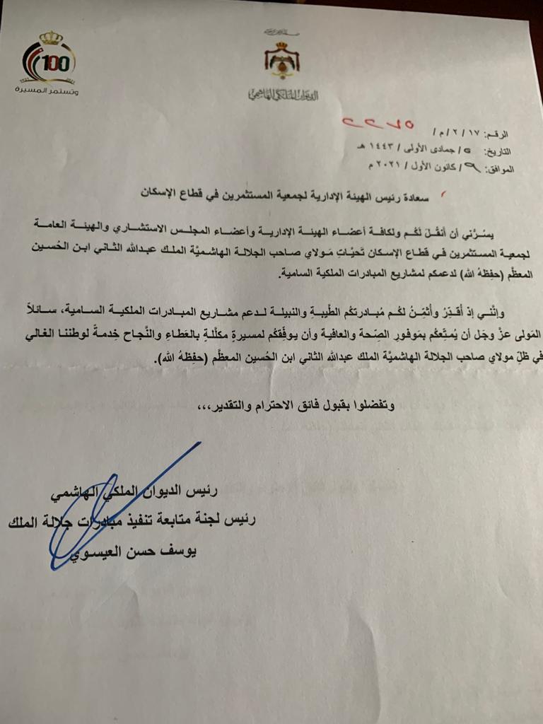 وثمن العيسوي مبادرة دعم جمعية مستثمري الإسكان والمجلس الاستشاري لمشاريع المبادرات الملكية السامية، متمنيا استمرار مسيرة العطاء والنجاح خدمة لوطننا في ظل القيادة الهاشمية .
