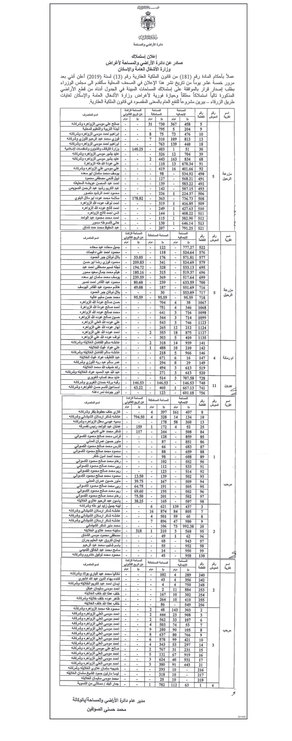 ويأتي ذلك، عملا بأحكام المادة رقم (181) من قانون الملكية العقارية رقم (13) لسنة 2019، لغايات طريق الزرقاء – بيرين، مشروعا للنفع العام.