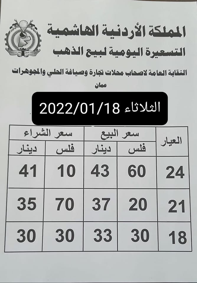 ووفق نقابة أصحاب محلات تجارة وصياغة الحلي والمجوهرات، فقد بلغ سعر بيع غرام الذهب عيار 21 الأكثر رغبة من الأردنيين بالسوق المحلية عند 37,20 دينارا لغايات شراء المواطنين من محلات الصاغة.