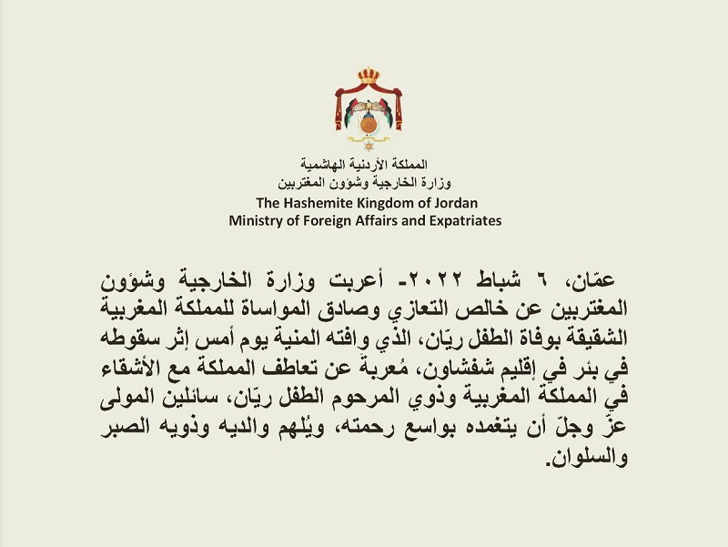 وكالة الناس – أعربت وزارة الخارجية وشؤون المغتربين الأردنية، اليوم الأحد، عن خالص التعازي وصادق المواساة للمملكة المغربية، بوفاة الطفل ريّان، الذي وافته المنية يوم أمس إثر سقوطه في بئر في إقليم شفشاون.