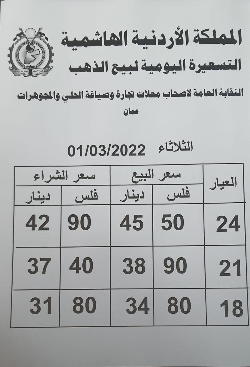 كما بلغ سعر غرام الذهب عياري 24 و18 لغايات الشراء من محلات الصاغة عند 45،50 دينارا، و34،80 دينارا على التوالي.