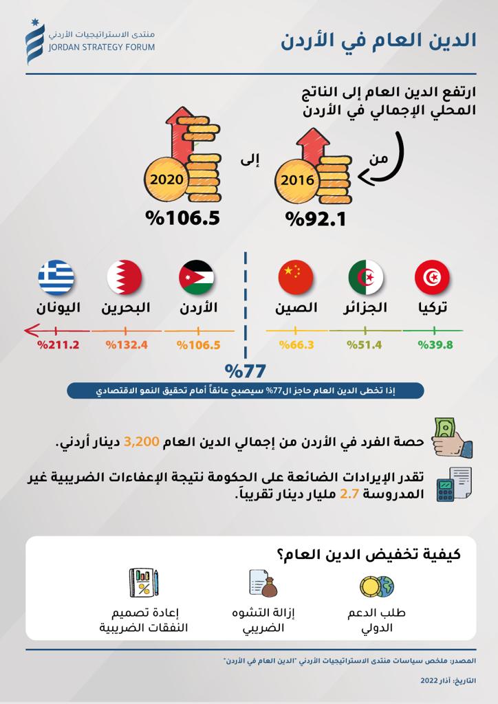 وبحسب المنتدى، فإن نسبة الدين العام إلى الناتج المحلي الإجمالي في الأردن تعتبر مرتفعة نسبياً مقارنة بالدول الأخرى إقليمياً، ودولياً؛ حيث شهد الأردن ارتفاعاً تدريجياً في نسبة الدين العام إلى الناتج المحلي الإجمالي منذ العام 2008، كما وساهمت التداعيات الاقتصادية لجائحة كورونا إلى زيادة هذه النسبة من 95.2% في العام 2019، إلى 106.5% في العام 2020. ووفقاً للمنتدى؛ فقد ترتب على هذه الزيادة ارتفاع مستوى فوائد الدين العام للحكومة المركزية نسبة إلى النفقات الرأسمالية من 79.4٪ في عام 2016 إلى 151.1٪ في عام 2020، وبقيمة 3 مليار دينار تقريباً.