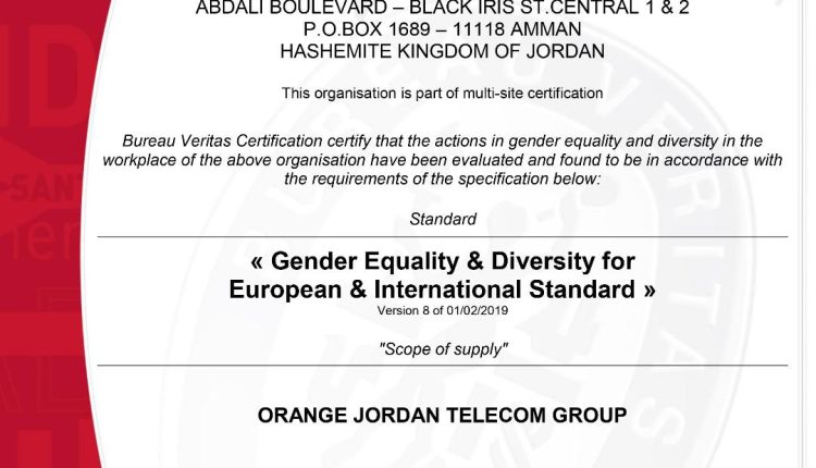 وكالة الناس – حصلت أورنج الأردن مؤخراً للمرة الثانية على شهادة المعيار الدولي الأوروبي للمساواة بين الجنسين(GEEIS) ، كما حازت لأول مرة على شهادة التنوّع تحت مظلة GEEIS والتي تعنى بتطبيق المعايير الخاصة بالأشخاص ذوي الإعاقة وتنوع الخلفيات الثقافية وهذا يعكس مدى التزامها بتطبيق مبدأ المساواة بين الجنسين والتنوّع في مكان العمل. وتصدر هذه الشهادات من قبل Bureau Veritas، وهي جهة مستقلّة تمنح هذا النوع من الشهادات.