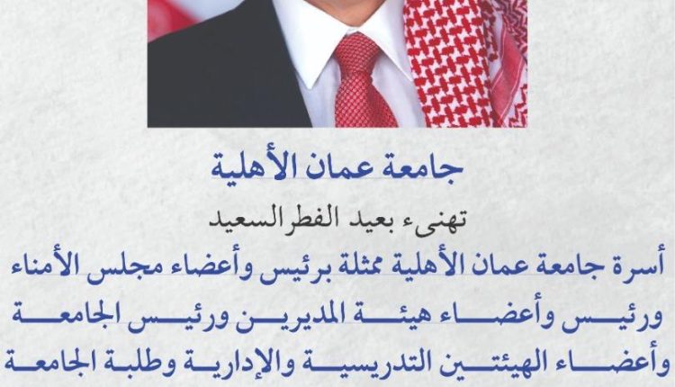 وكالة الناس – أسرة جامعة عمان الأهلية ممثلة برئيس وأعضاء مجلس الأمناء ورئيس وأعضاء هيئة المديرين ورئيس الجامعة وأعضاء الهيئتين التدريسية والإدارية وطلبة الجامعة يتقدمون بمناسبة حلول عيد الفطر السعيد بأسمى ايات التهاني والتبريكات من قيادتنا الهاشمية وعلى رأسها جلالة الملك عبدالله الثاني ابن الحسين المعظم وولي عهده الامين سمو الامير الحسين ومن الشعب الاردني ومن أمتنا العربية والأمة الاسلامية، داعين الله عز وجل ان يعيد هذه الذكرى المباركة عليهم جميعا بالخير والبركات ، وكل عام والوطن وقائد الوطن بألف خير.