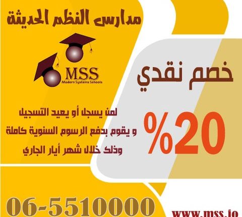 مدارس النظم تعلن عن خصم نقدي 20% لمن يسدد الرسوم السنوية كاملة On مايو 12, 2022 Share وكالة الناس – أعلنت إدارة مدارس النظم الحديثة عن خصم نقدي 20% لمن يسجل أو يعيد التسجيل ويقوم بدفع الرسوم السنوية كاملة وذلك خلال شهر أيار الجاري . Google News تابعونا عبر الأخبار باللغة الإنجليزية إشترك في قناة وكالة الناس الإخبارية تابع وكالة الناس الإخبارية على فيسبوك تابع وكالة الناس الإخبارية على تويتر تابعونا عبر تطبيق نبض