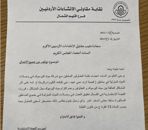 وكالة الناس ــ استمرت شركة مياه اليرموك صمتها بعد قرار نقابة مقاولي الإنشاءات فرع إقليم الشمال بتعليق الأعمال مع شركة مياه اليرموك نتيجة لعدم قيام الشركة بحل المشاكل العالقة والتي تحدث عنها مجموعة كبيرة من شركات المقاولات.