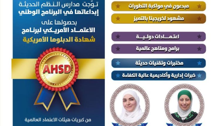 البرنامج الأجنبي AHSD في مدارس النظم الحديثة On يونيو 21, 2022 Share وكالة الناس – قسم البرنامج الأمريكي AHSD .. قسم مميز وكادر تعليمي مؤهل وخبرات تربوية خاصة.. للاستفسار والتسجيل الاتصال على 065510000