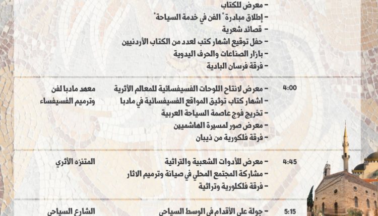 وبينت الوزارة، أن الفعاليات التي ستقام في مركز زوار مادبا الثلاثاء المقبل، تشتمل على عزف موسيقي للقوات المسلحة، ومعرض للكتاب، واطلاق مبادرة “الفن في خدمة السياحة”، وبازار للصناعات والحرف اليدوية، وفقرة غنائية لفرقة فرسان البادية، الى جانب توقيع لإشهار كتب لعدد من الكتاب الأردنيين.