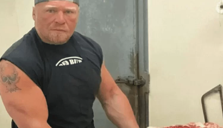 ويظهر في الصورة المصارع الأميركي الشهير بروك ليسنر وهو يقطّع اللحوم.