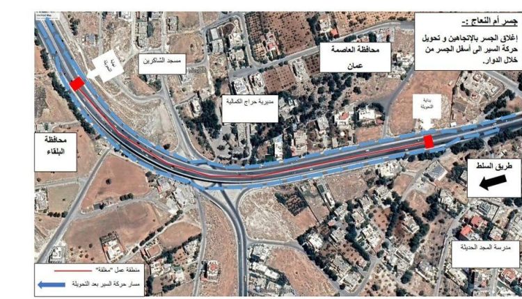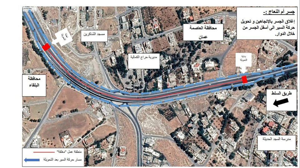 وقالت الوزارة في بيان صحفي صادر عن وحدة الإعلام والاتصال، إنه سيتم اغلاق السير من خلال جسر ام النعاج و تحويل حركة السير للمركبات إلى أسفل الجسر وذلك يشمل الإتجاهين من صويلح إلى السلط وذلك في تمام الساعة الحادية عشر من مساء يوم الألربعاء 12/10/2022 ،وعلى سالكي الطريق اتباع الاشارات الارشادية والتحذيرية الموجودة في الموقع.