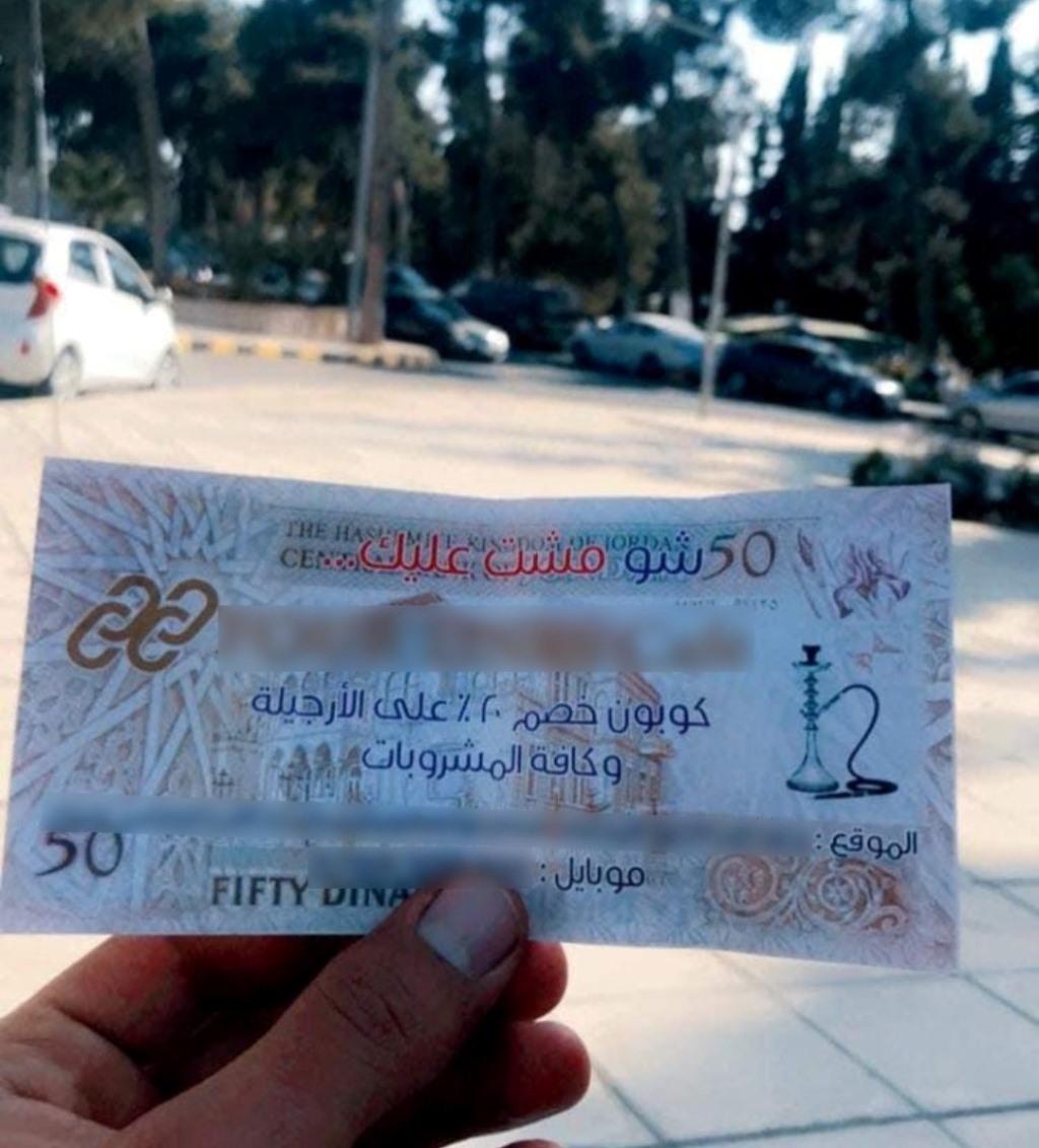 وقال الناطق الإعلامي باسم مديرية الامن العام إنّ معلومات وردت عن قيام مالك أحد المقاهي في العاصمة باستخدام صور لأوراق نقدية من فئة الخمسين ديناراً من أجل الدعاية للمقهى وإعطاء خصومات لزبائنه .