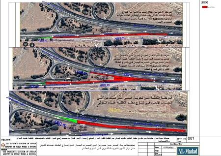 وأوضحت أننه سيتم اغلاق جزئي للطريق واجراء تحويلات مرورية على عدة مراحل متزامنة وكالاتي: ١- المرحلة الاولى: تتضمن اغلاق المسرب الايمن من شارع الملك عبدالله الثاني وتحويل حركة السير إلى المسرب الايسر للاتجاه القادم من شارع الملك عبد الله الثاني باتجاه طريق المطار ولمسافة ٥٠٠ متر ٢- المرحلة الثانية: تتضمن تحويل السير من مسربين الى المسرب اليسار في شارع مطار الملكة علياء الدولي ومن مسربين الى المسرب اليمين في شارع الملك عبدالله الثاني والقادم من دوار الثورة العربية الكبرى الى شارع المطار ٣ -المرحلة الثالثة:تتضمن تحويل السير من مسربين الى المسرب الايمن في شارع مطار الملكة علياء الدولي