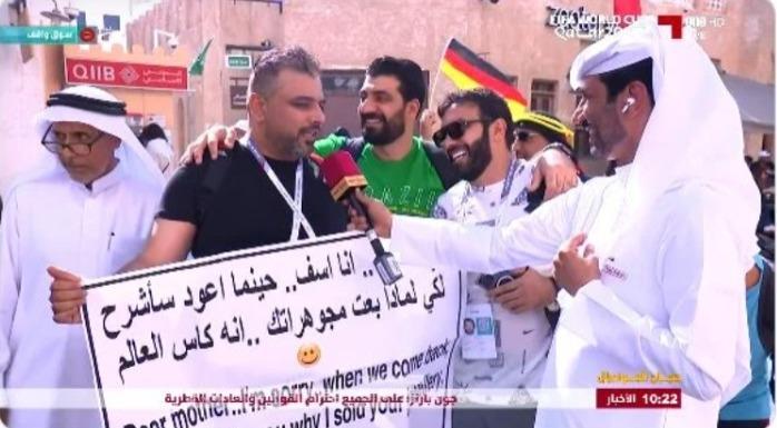 ووقف أحد المشجعين العرب في منطقة سوق واقف في قطر، ممسكا بلافتة كتب عليها: “أمي الغالية، أنا آسف، حينما أعود سأشرح لكي لماذا بعت مجوهراتك، إنه كأس العالم”.
