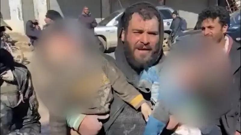 فقد شارك آلاف السوريين على مواقع التواصل خلال الساعات الماضية، فيديو لأب مكلوم يودع طفليه بعد أن سحبهما جثتين من تحت الأنقاض في الشمال السوري.