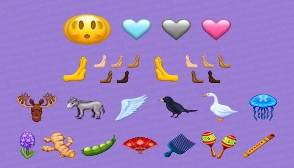 وسيتم أيضاً تضمين رموز تعبيرية للحيوانات والطعام والزهور الجديدة، مثل الحمار، والموس، والإوزة، وطائر أسود، والجيلي فيش، والزنجبيل، والبازلاء، وغير ذلك.