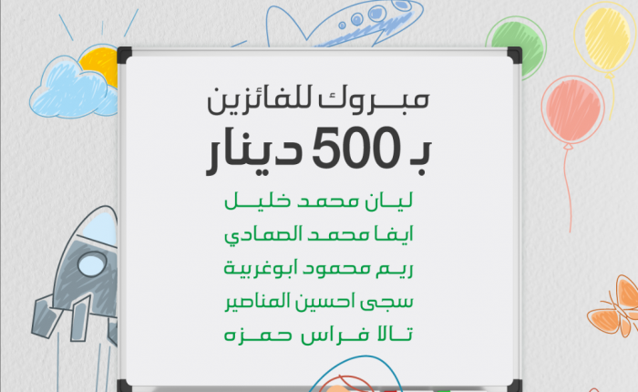 وبموجب السحب، أضاف بنك صفوة الإسلامي المبلغ في حساب كل من الطفلة ليان خليل، والطفلة إيفا الصمادي، والطفلة ريم أبو غربية، والطفلة سجى المناصير، والطفلة تالا حمزه، وهن اللواتي فزن بالجائزة النقدية لحساب توفير الأطفال “كنزي”.