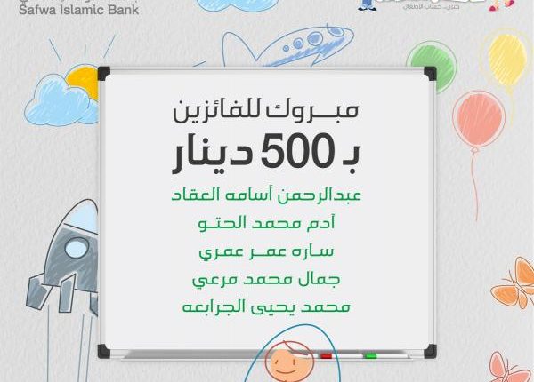 وكالة الناس – كشف بنك صفوة الإسلامي عن أسماء الفائزين الخمسة بجوائز حساب توفير الأطفال “كنزي” لشهر شباط 2023، والذين حصل كل منهم على مبلغ 500 دينار أردني، بموجب سحب أجري مؤخراً.