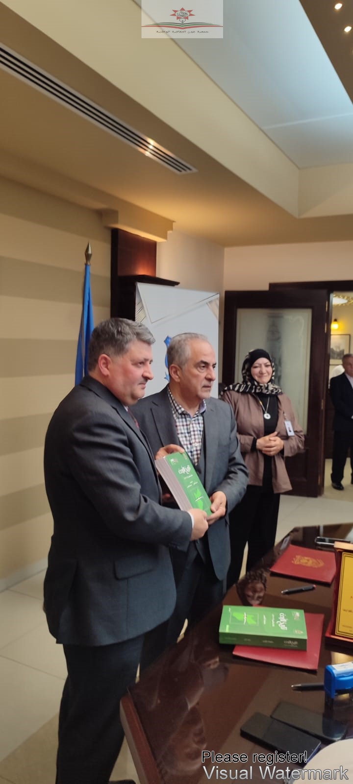 وبعد إنتهاء مراسم التوقيع تبادل حمدان والعزام الدروع التذكارية بهذه المناسبة كما قدم العزام أحد مقتنيات مكتبة الجمعية (مكتبة المؤرخ سليمان الموسى) نسخة عن كتاب “تاريخ الأردن من عام 1900-عام 1995” تأليف سليمان الموسى ومنيب الماضي