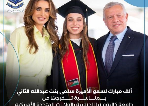 وكالة الناس – يتقدم رئيس وأعضـاء مجلس أمناء جامعة عمان الاهلية ورئيـس وأعضـاء هيئة المديرين ورئيس الجامعة وأسرتها الاكاديمية والادارية والطلابية بأسمـى آيات التهـاني والتبريكات إلى مقام حضرة صاحب الجلالة الهاشمية الملك عبدالله الثاني بن الحسين المعظم وصاحبة الجلالة الملكة رانيا العبدالله المعظمة بمناسبة تخرج الأميرة سلمى بنت عبدالله الثاني بدرجة البكالوريوس في علم الآثار من جامعة كاليفورنيا، متمنين لصاحبة السمو الملكي الأميرة سلمى بنت عبدالله الثاني المعظمة المزيد من التقدم والنجاح.
