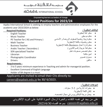 وظائف شاغرة لدى مدرسة العقبة الدولية