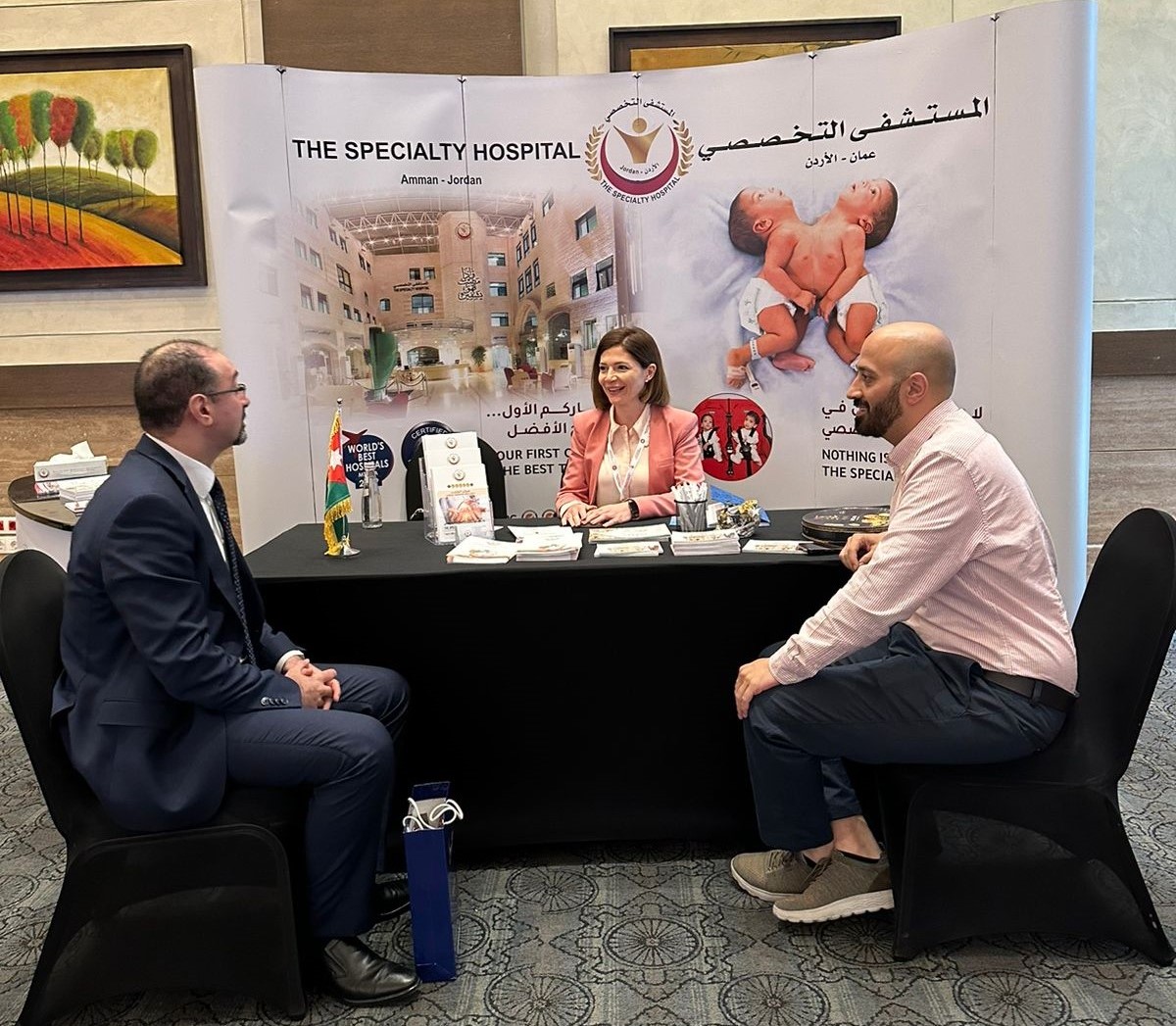 ومن جهة أخرى شارك المستشفى التخصصي في المعرض المقام على هامش هذا الملتقى، وقد تشرف جناح المستشفى بزيارة السفير الاردني في بغداد الدكتور منتصر العقلة والقنصل العام في الإقليم السيد فؤاد المجالي وعدد كبير من الزوار والمراجعين الذين أبدوا اعجابهم بالتقنيات الحديثة في علاج مختلف الحالات المرضية والامكانات المتطورة المتوفرة لدى المستشفى والتي مكنته من ان يضاهي أكبر المستشفيات العالمية. كما وقدم أطباء المستشفى استشارات طبية لعدد كبير من المراجعين والزوار للمعرض.
