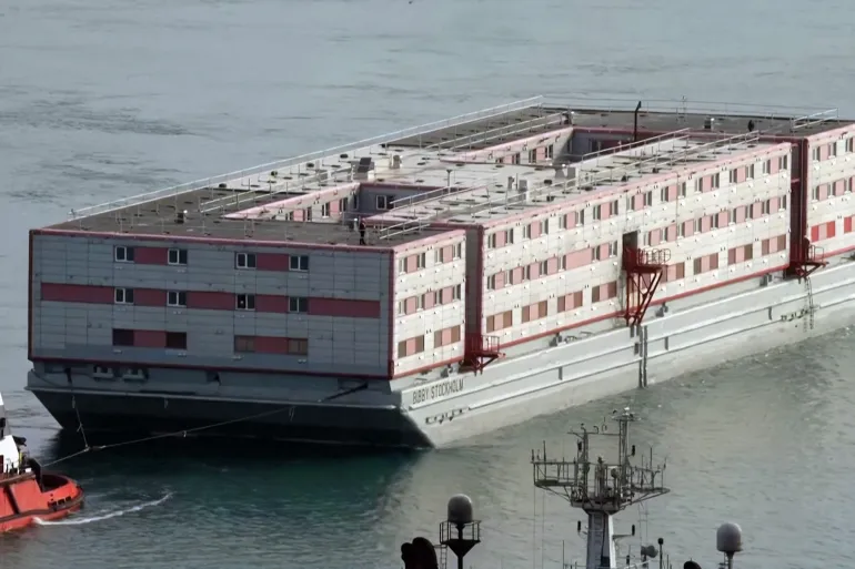 وكالة الناس – رست في ميناء بورتلاند جنوبي بريطانيا أول عوامة تستأجرها الحكومة البريطانية لإيواء طالبي اللجوء تتسع لنحو 500 شخص.