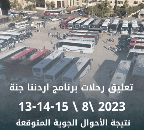 وكالة الناس – قررت وزارة السياحة والآثار تعليق رحلات برنامج أردننا جنة ابتداء من يوم غدا الأحد ولمدة ثلاثة أيام، وسيتم استئناف الرحلات بشكلها المعتاد صباح يوم الاربعاء، وذلك حفاظا على سلامة المشاركيين، نتيجة الأحوال الجوية المتوقعة وما ستشهده المملكة من ارتفاع في درجات الحرارة خلال الأيام المقبلة.