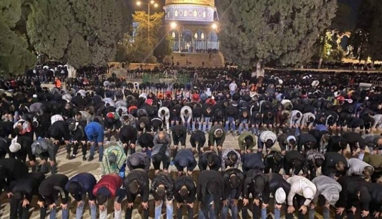 وأم آلاف المصلين باحات المسجد الأقصى لأداء صلاة الفجر، داخل المصليات المسقوفة وفي باحات المسجد، شاركها عائلات مقدسية بينها أطفال ونساء، قاموا بإعمار جنبات الأقصى.
