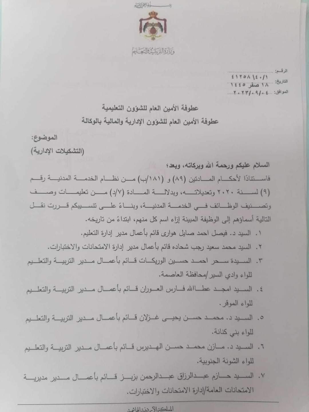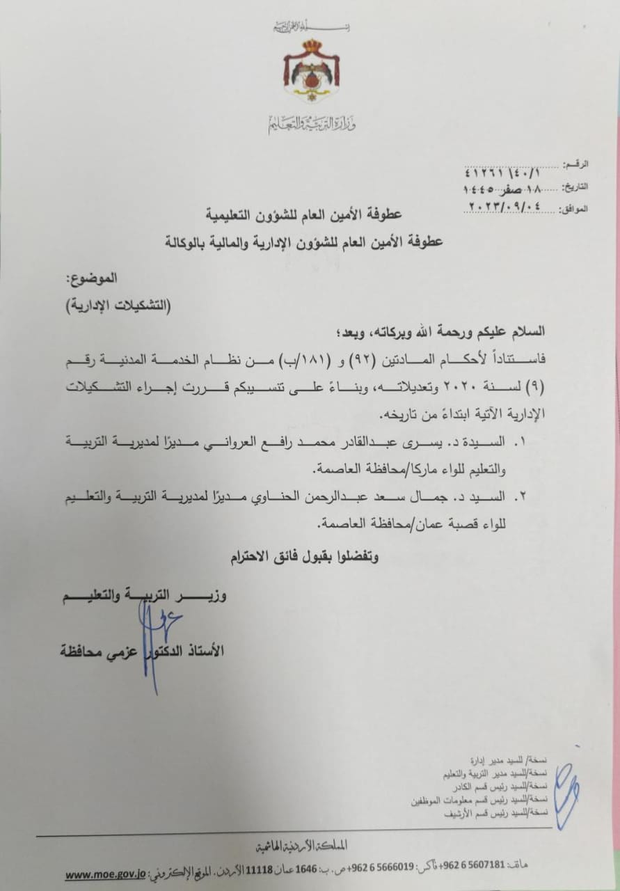تشكيلات إدارية في التربية … أسماء Last updated سبتمبر 4, 2023 Share وكالة الناس – قرر وزير التربية والتعليم الدكتور عزمي محافظة، الاثنين، إجراء تشكيلات إدارية في الوزارة وذلك استنادا لاحكام المادتين 92 و 181/ب من نظام الخدمة المدنية رقم 9 لسنة 2020 وتعديلاته. وتاليا الأسماء: Google News تابعونا عبر الأخبار باللغة الإنجليزية إشترك في قناة وكالة الناس الإخبارية تابع وكالة الناس الإخبارية على فيسبوك تابع وكالة الناس الإخبارية على تويتر تابعونا عبر تطبيق نبض