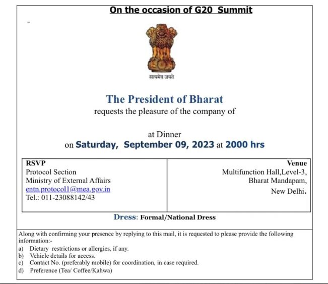 وفي الدعوة المرسلة إلى الحاضرين، الثلاثاء، جاءت عبارة “رئيس بهارات” بدلًا من “رئيس الهند”.