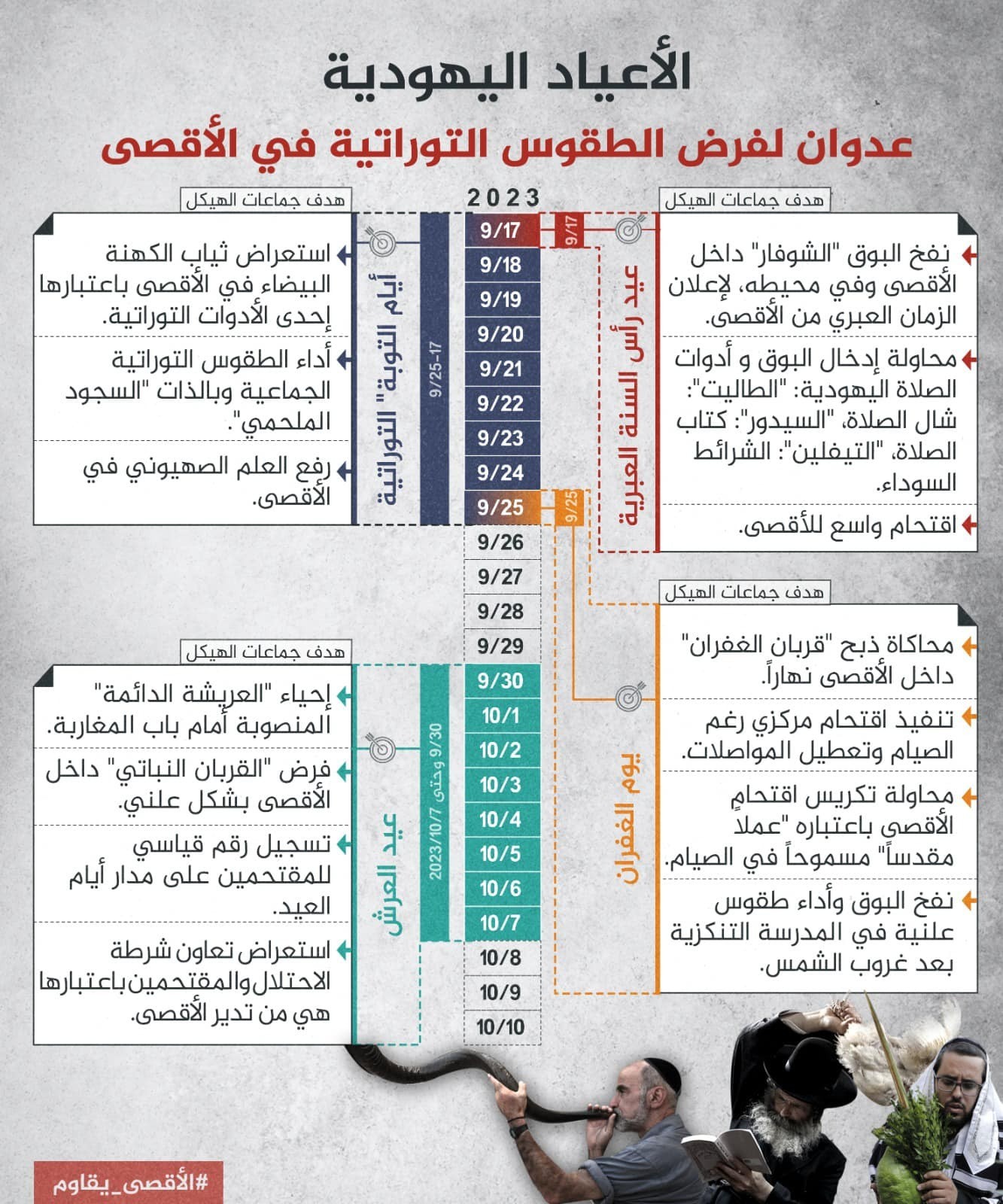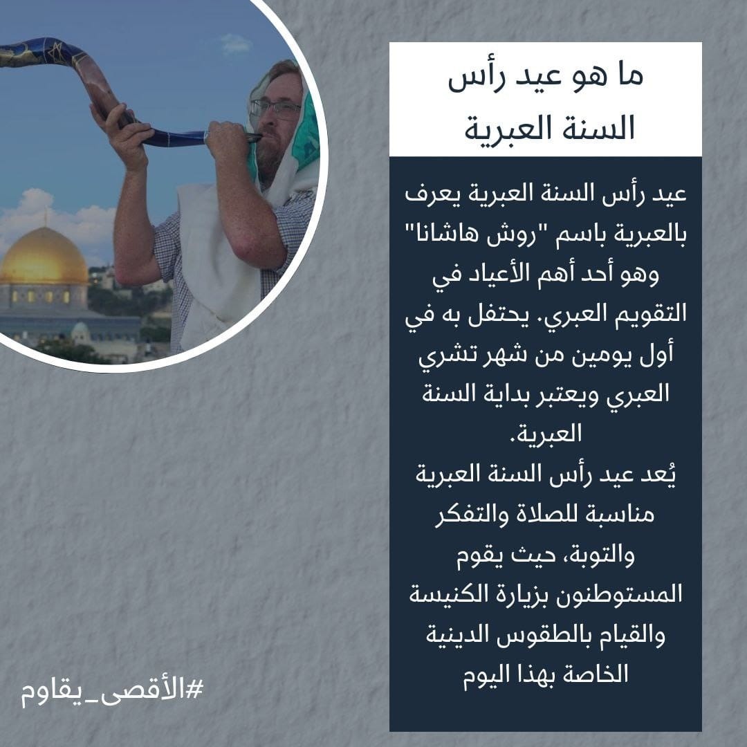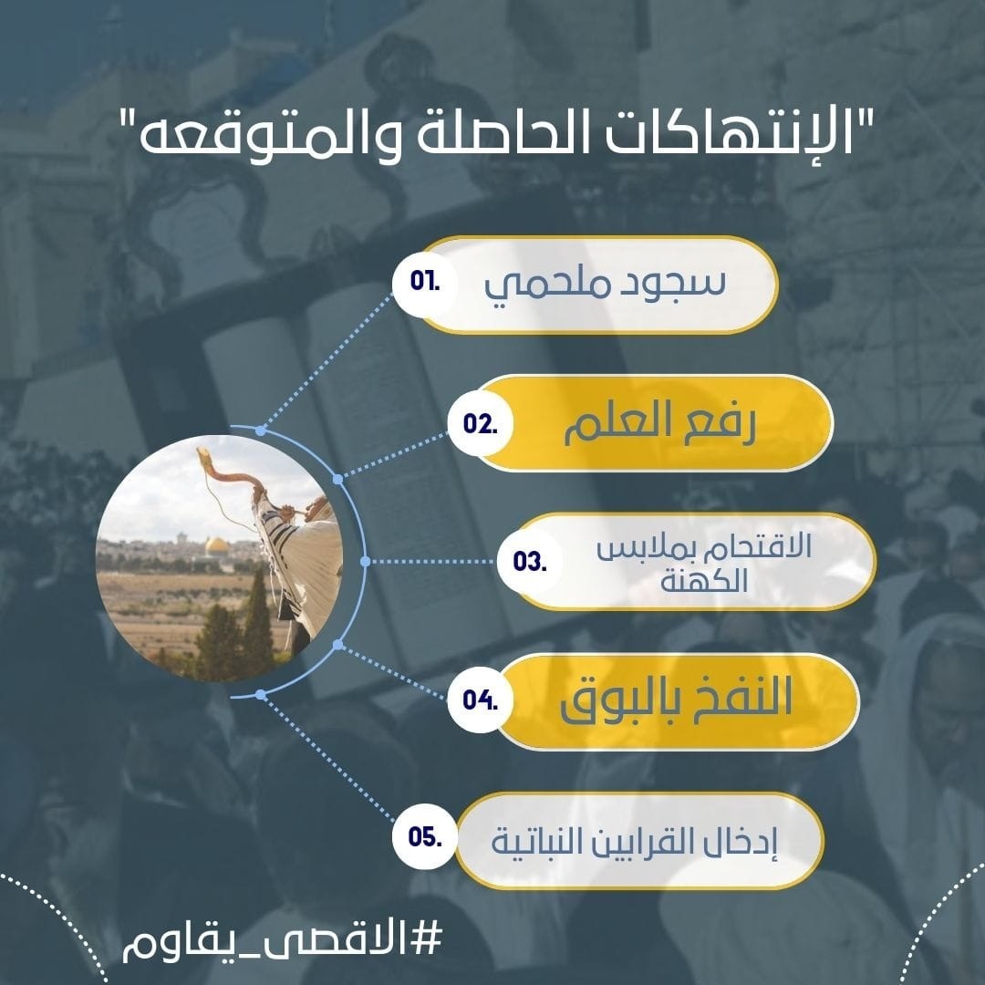 كما تهدف إلى إبراز مخاطر الاقتحامات على الأقصى، ومخططات “جماعات الهيكل” المتطرفة وحكومة الاحتلال لفرض واقع جديد فيه خلال الأعياد، ويمتد موسم الأعياد التوراتية على مدى 22 يومًا بدءًا بـ “رأس السنة العبرية” يوم الأحد، متبوعًا بـ”أيام التوبة”، وصولًا إلى “عيد الغفران” في 25/9، و “عيد العرش” من 30/9 حتى 7/10 المقبل.