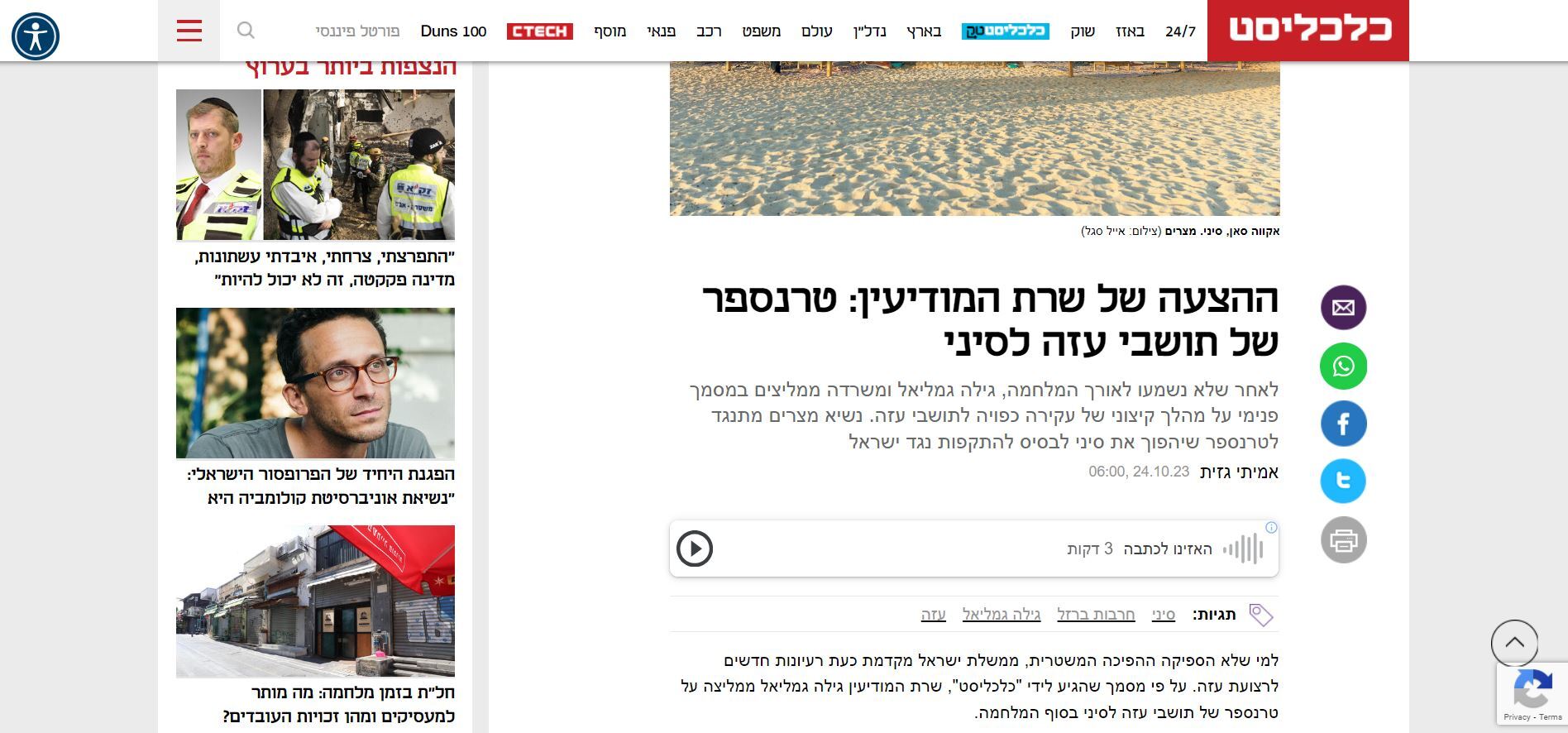 وأضافت الصحيفة أنه بالرغم من معارضة الرئيس المصري عبد الفتاح السيسي علانية لهذه الخطة وتوضحيه أن هذا المخطط سيجعل من سيناء قاعدة لشن هجمات ضد إسرائيل مما قد يجر مصر لحرب ضد تل أبيب وتهديد اتفاقية السلام بين البلدين، إلا أن الوزيرة الإسرائيلية مصممة على تنفيذ المخطط وتهجير سكان غزة عقب انتهاء الحرب.