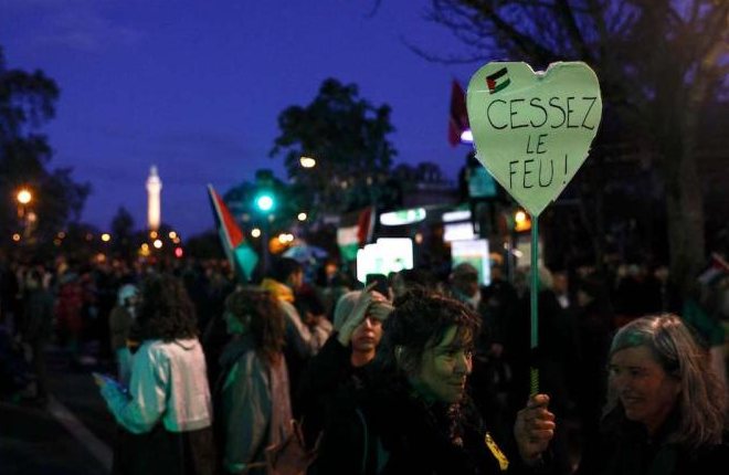 شهدت باريس تظاهرات حاشدة، حيث سار آلاف المحتجين في وسط العاصمة للمطالبة بوقف إطلاق النار رافعين لافتات كتب عليها “أوقفوا دائرة العنف” و”عدم فعل شيء، وعدم قول شيء، يعني التواطؤ”.