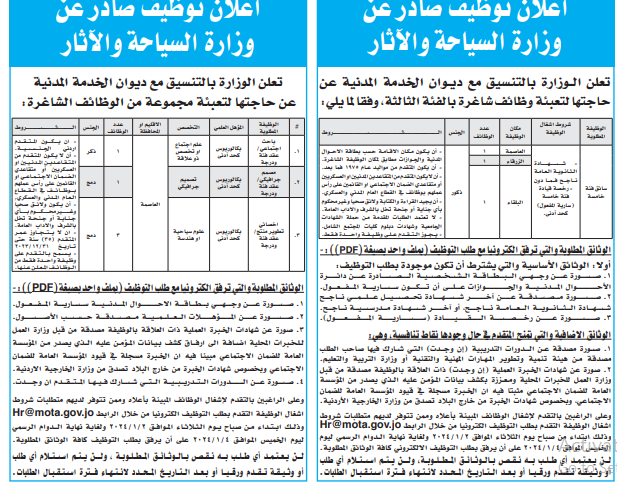 وظائف شاغرة لدى وزارة السياحة والاثار