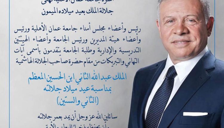 وكالة الناس – رئيس وأعضاء مجلس أمناء جامعة عمان الأهلية ورئيس وأعضاء هيئة المديرين ورئيس الجامعة وأعضاء الهيئتين التدريسية والإدارية وطلبة الجامعة يتقدمون بأسمى آيات التهاني والتبريكات من مقام حضرة صاحب الجلالة الهاشمية الملك عبدالله الثاني ابن الحسين المعظم بمناسبة عيد ميلاد جلالته (الثاني والستين).