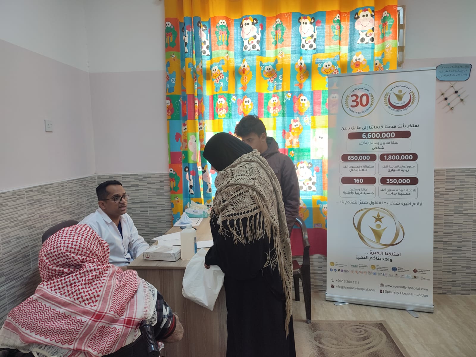 وكالة الناس -نظم المستشفى التخصصي يوم طبي مجاني بالتعاون مع جمعية المنتدى الأردني للرعاية والثقافة الصحية لأهالي مخيم غزة الذي يقع في محافظة جرش، حيث قام المستشفى بإرسال فريق طبي من كافة الاختصاصات الطبية (جراحة العظام وجراحة الأنف والأذن والحنجرة والمفاصل والنسائية والباطنية والأطفال) والصيادلة وطاقم متكامل من الكوادر التمريضية، حيث انتفع من هذا النشاط ما يزيد عن 800 مريض من أهالي المخيم.