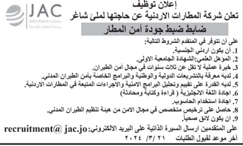 وظيفة شاغرة لدى شركة المطارات الاردنية