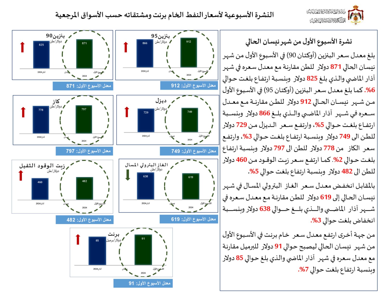 كما بلغ معدل سعر البنزين أوكتان (95) في الأسبوع الأول من شهر نيسان الحالي 912 دولارا للطن مقارنة مع معدل سعره في شهر آذار الماضي والذي بلغ 866 دولارا وبنسبة ارتفاع بلغت حوالي 5%.