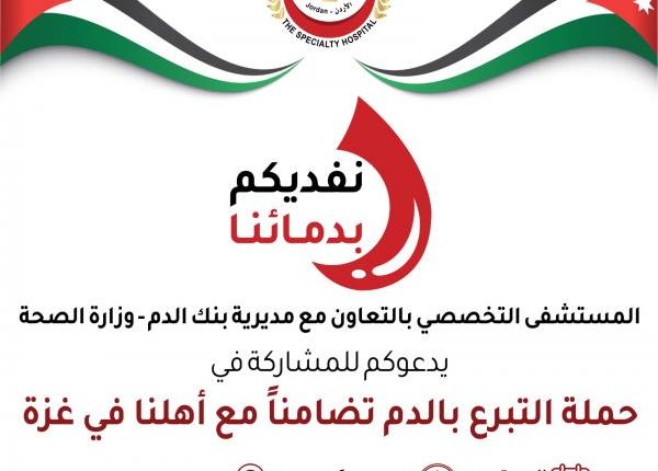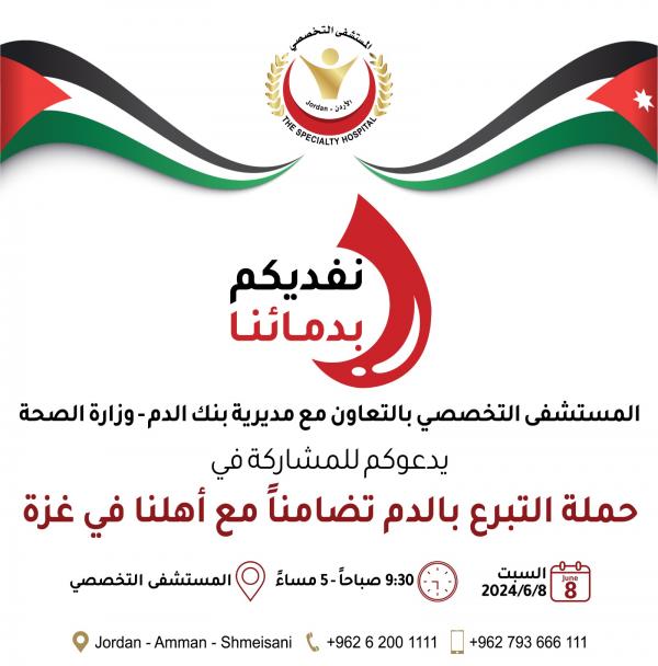 وكالة الناس  – صرح الدكتور فوزي الحموري مدير عام المستشفى التخصصي عن إطلاق المستشفى لحملة واسعة للتبرع بالدم وبالتعاون مع مديرية بنك الدم في وزارة الصحة؛ دعماً وتضامناً مع أهلنا في قطاع غزة، معلناً بأن حملة التبرع بالدم ستبدأ يوم السبت الموافق 8/6/2024 في تمام الساعة التاسعة والنصف صباحاً وحتى الخامسة مساءً.