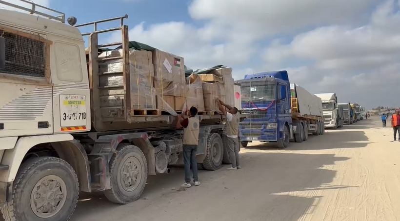 وحملت الشاحنات الطرود الغذائية الأساسية والمواد الاغاثية مثل الخيم والمستلزمات الطبية، ليصار إلى توزيعها على أهلنا في غزة من خلال الجمعيات والمنظمات الشريكة في القطاع.